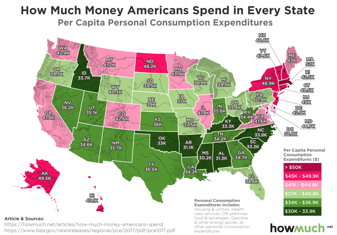Washington, D.C., and Massachusetts finished as the top two, followed by Alaska. Both North Dakota and Alaska have oil wealth, which puts pressure on rising prices. If you clicked on the map, you noticed the state was a reddish color. The more red the state is (non-politically speaking), the more money the average person from there spends.